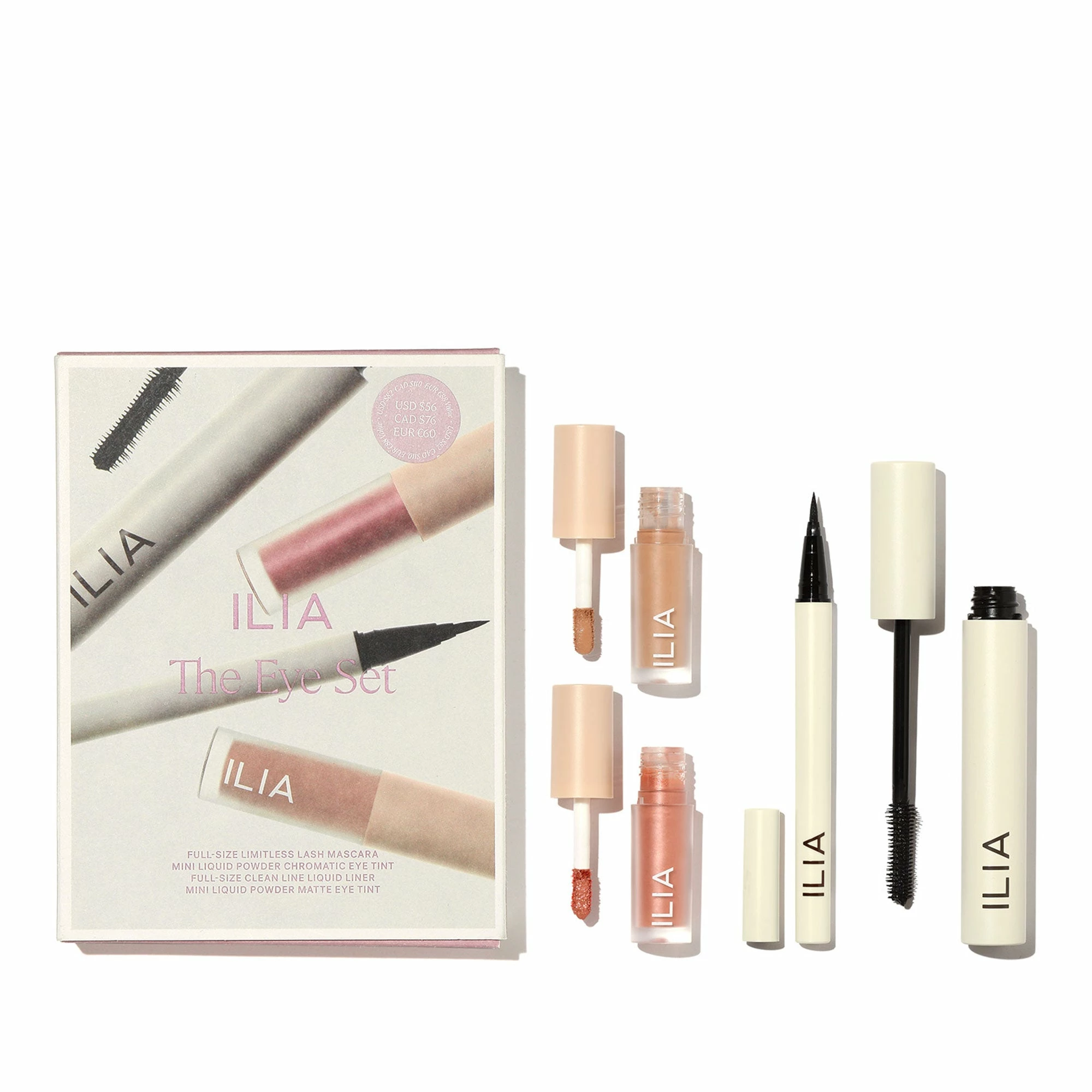 Un coffret qui regroupe 4 essentiels yeux Ilia pour un make-up réussi: le Mascara Allongeant Limitless Lash, le Clean Line Eye-Liner Liquide, le Liquid Powder Chromatic Eye Tint en teinte Mythic et le Liquid Powder Matte Eye Tint en teinte Adobe.